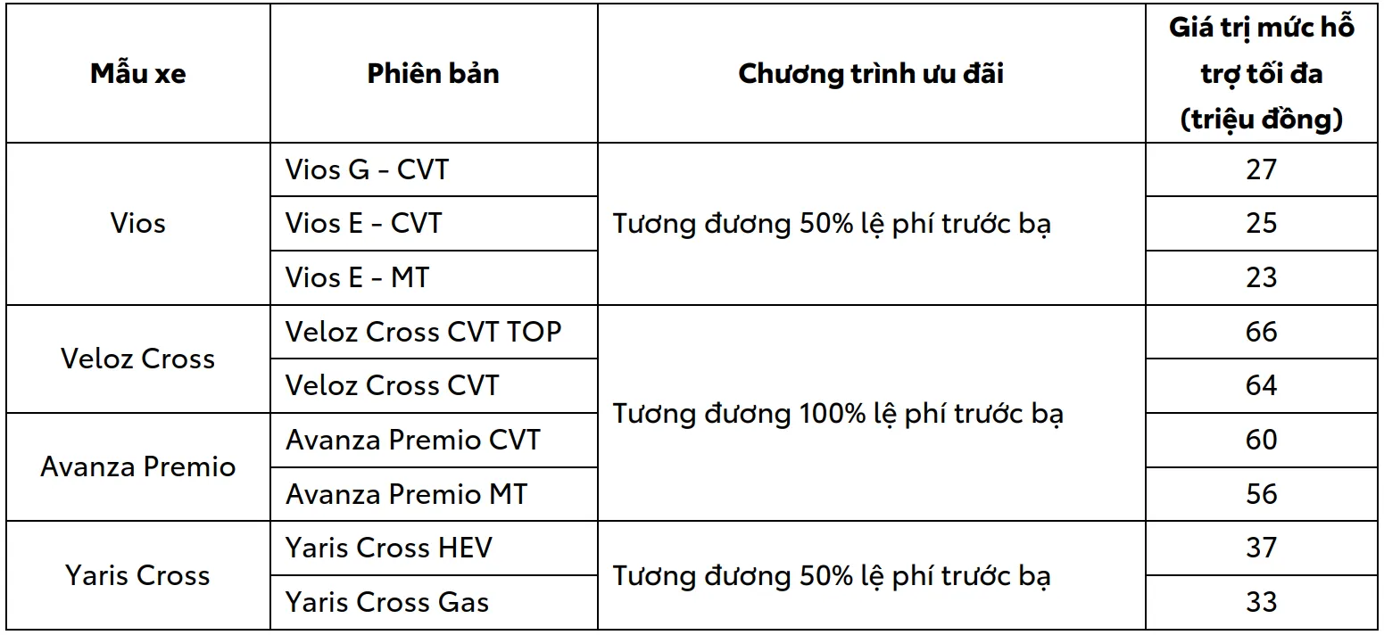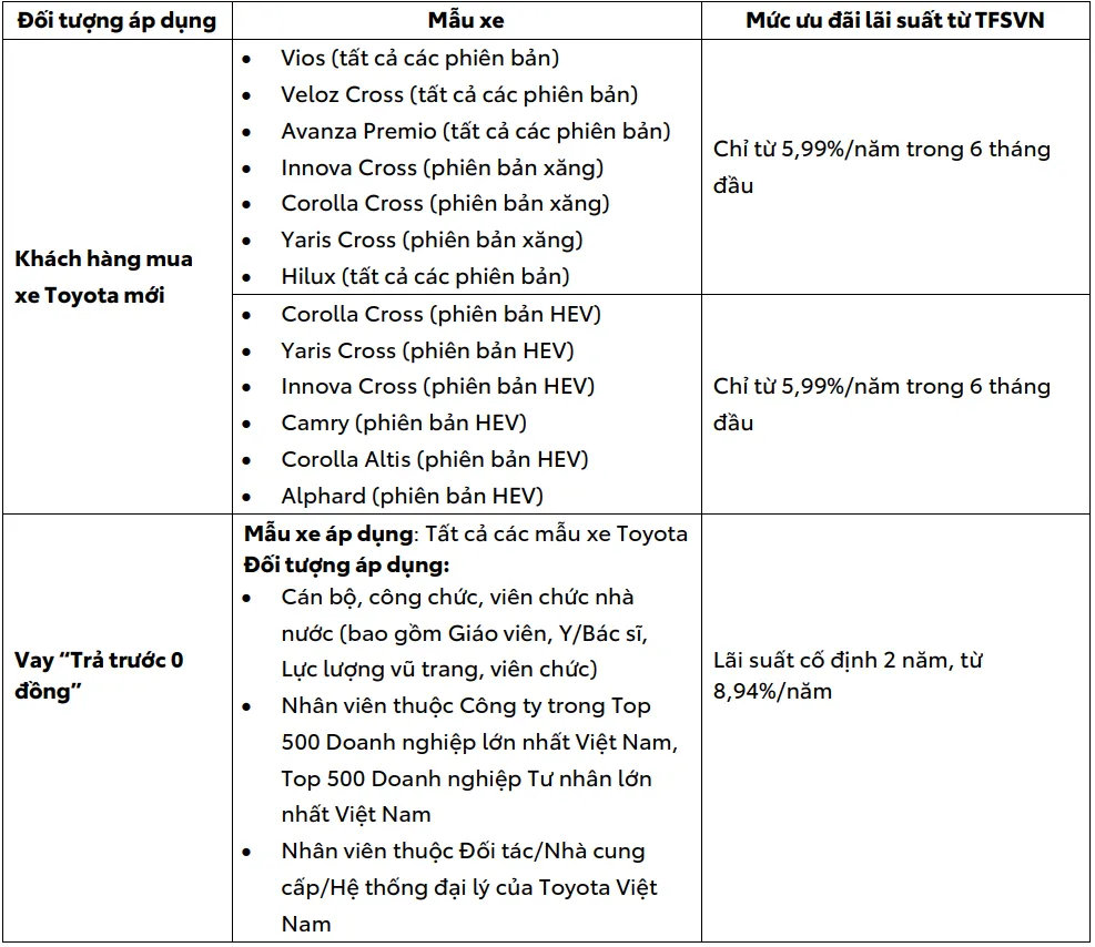 Trong tháng 3/2026, Công ty tài chính Toyota Việt Nam (TFSVN) cũng thực hiện chương trình ưu đãi cho các khách hàng vay mua xe với mức lãi suất ưu đãi hấp dẫn: